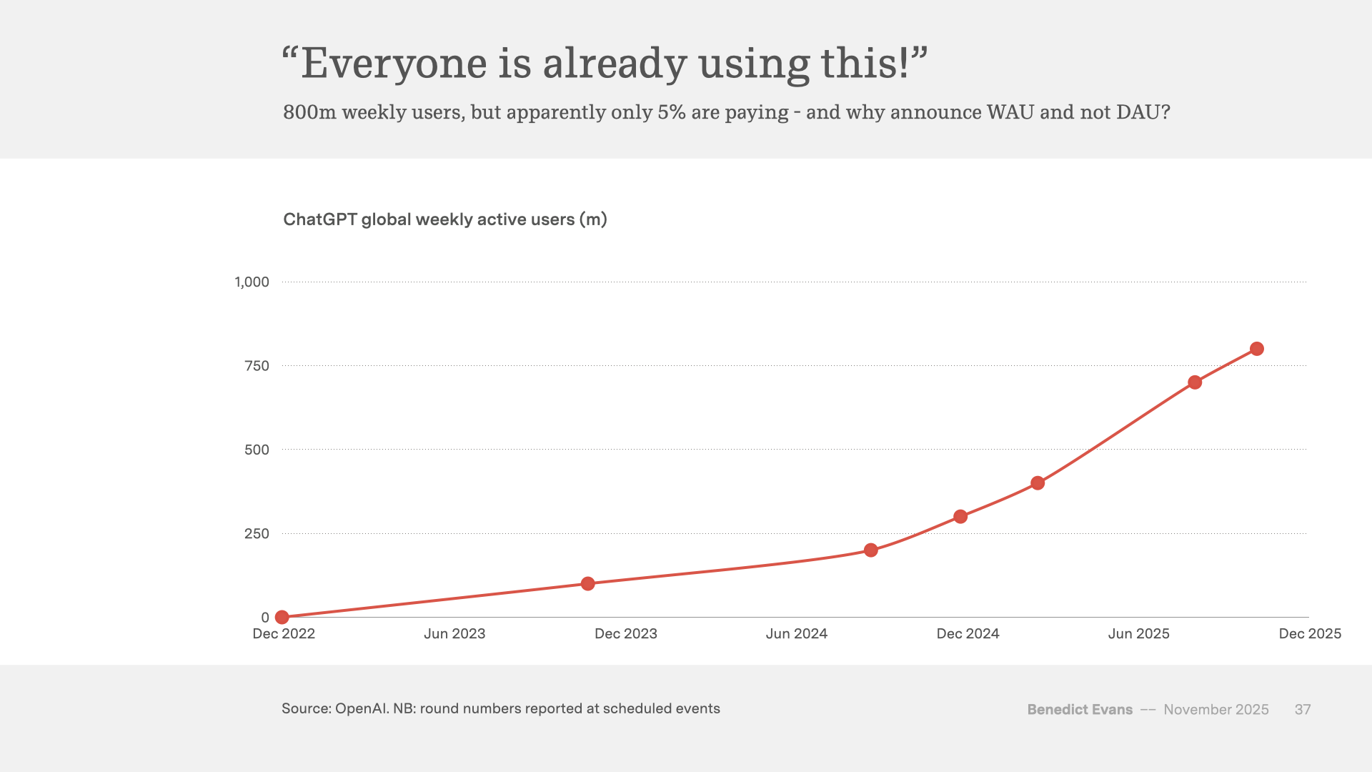 First, the business as we see it today doesn’t have a strong, clear competitive lead. It doesn’t have a unique technology or product. The models have a very large user base, but very narrow engagement and stickiness, and no network effect or any other winner-takes-all effect so far that provides a clear path to turning that user base into something broader and durable. Nor does OpenAI have consumer products on top of the models themselves that have product-market fit.